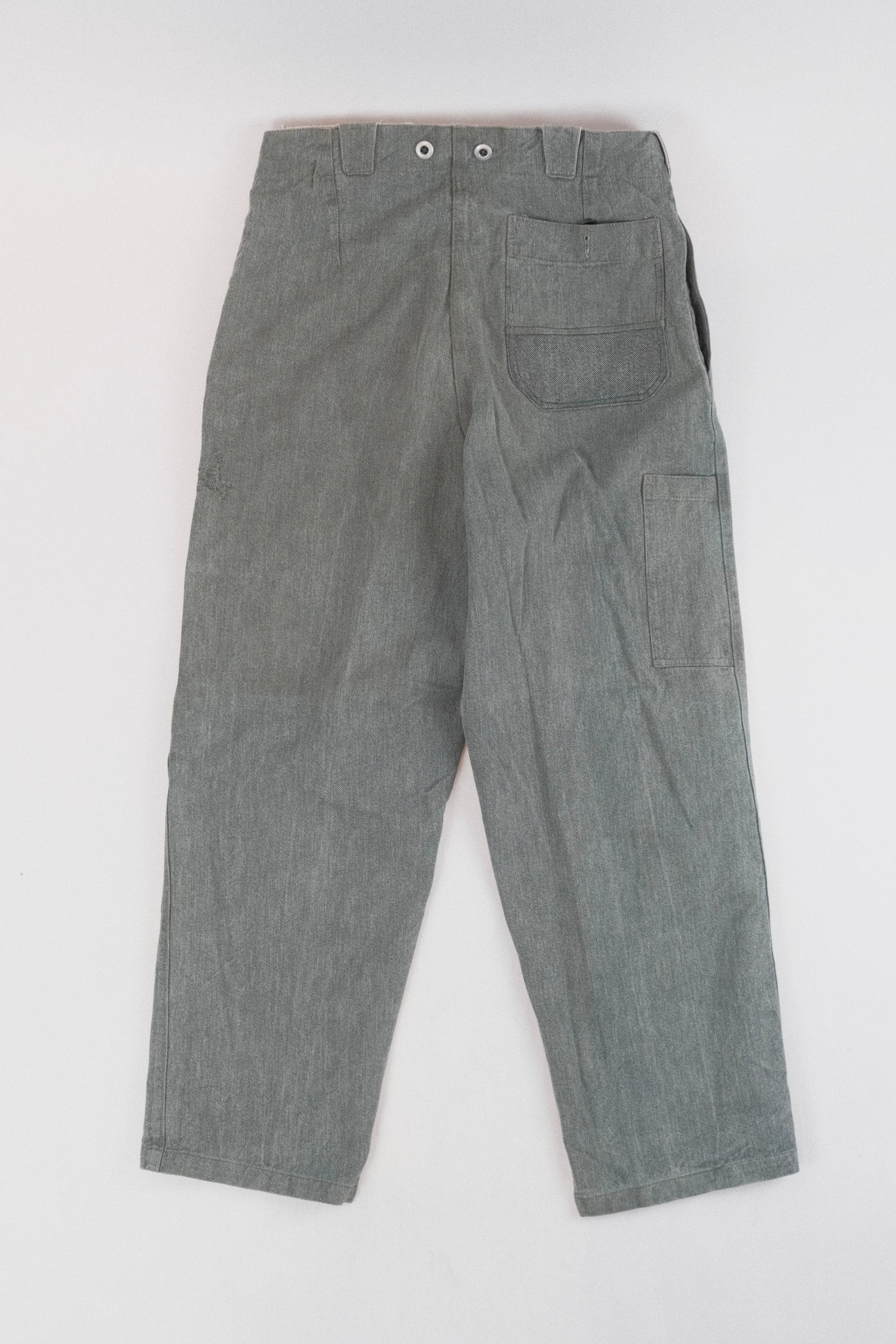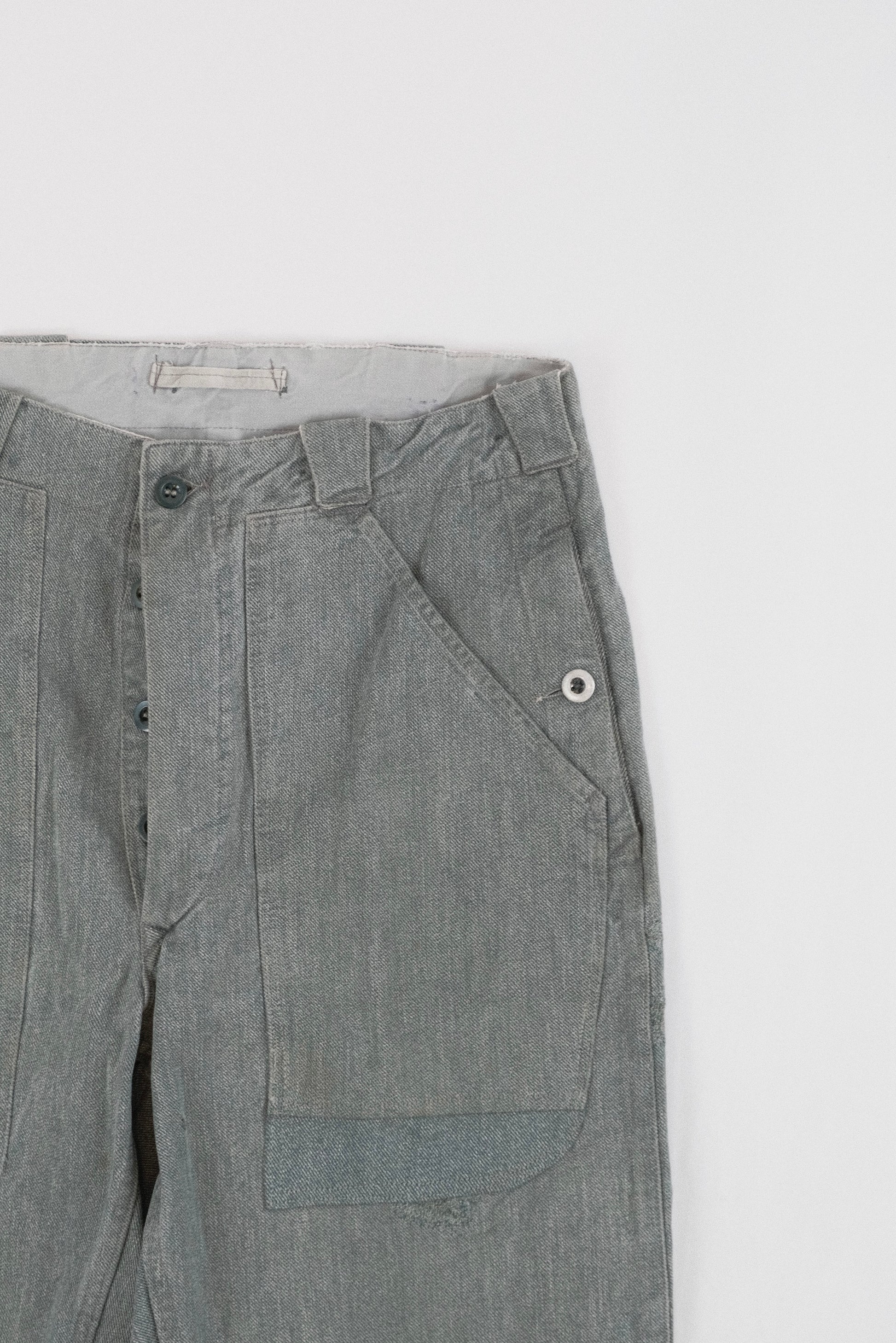 Authentic 1940s Swiss Army work pants crafted in Switzerland from sturdy heavy denim. The iconic salt-and-pepper grey patina showcases natural sun fading and aging that only decades can achieve. Excellent vintage condition with genuine character and patina throughout. Refer to detailed measurements for accurate sizing.