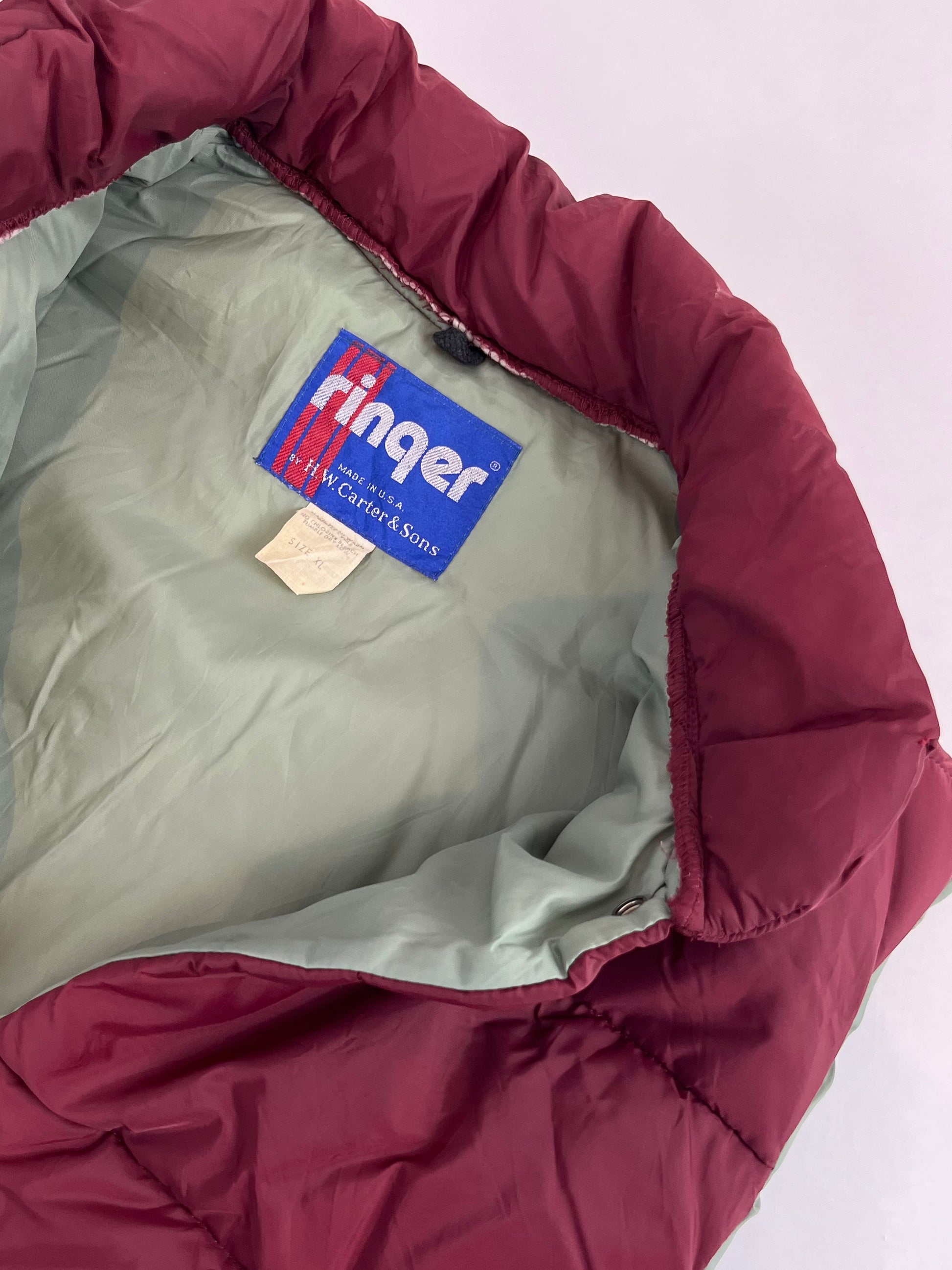 Questo gilet imbottito vintage anni '70 di Ringer, prodotto negli Stati Uniti, offre un ottimo mix di stile e funzionalità. L'esterno bordeaux si abbina perfettamente all'interno azzurro e rosso.