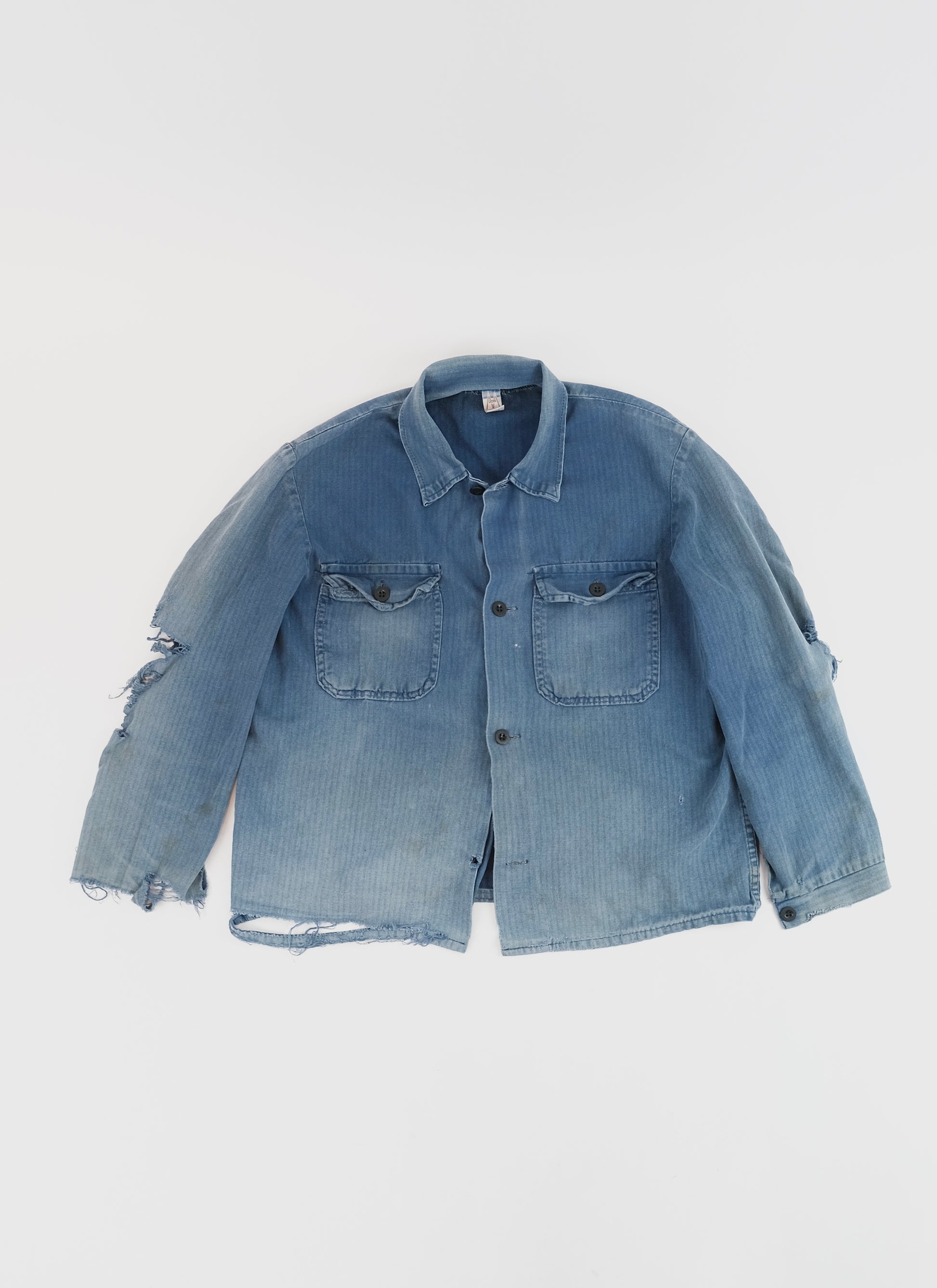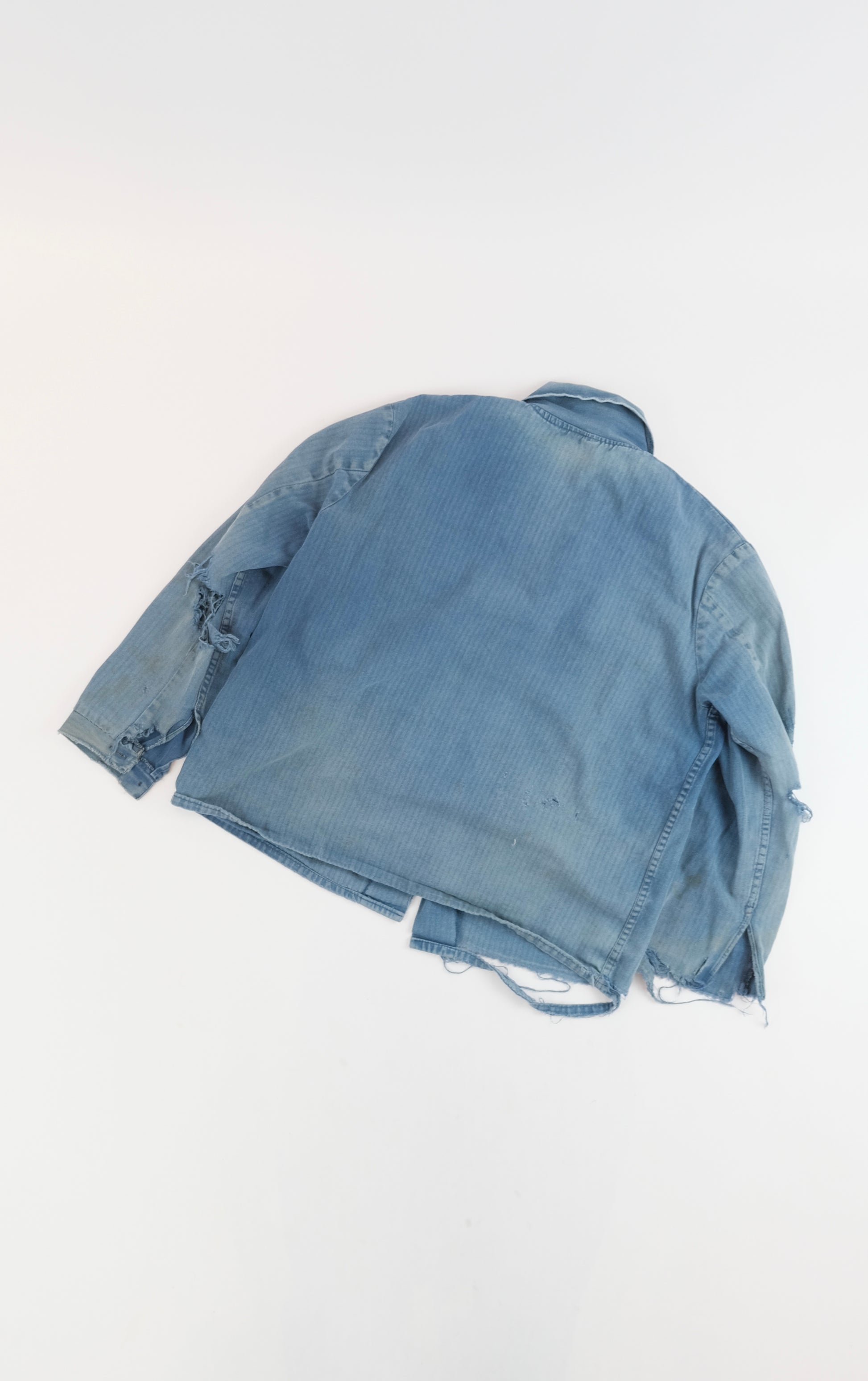 Questa giacca da lavoro degli anni '60 presenta il look autentico del classico blu da lavoro. Taglia etichettata 46, veste una S.