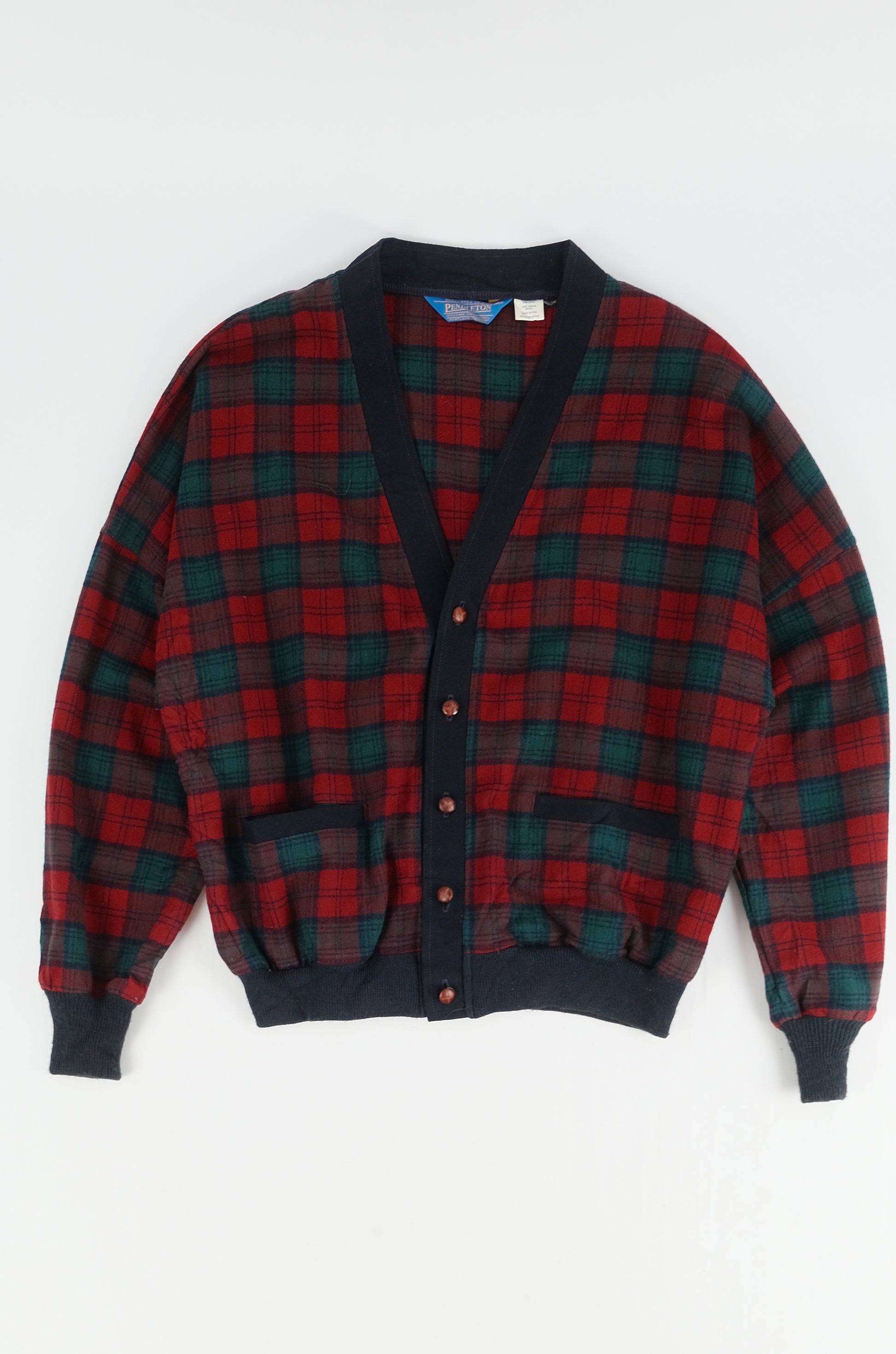 Discover authentic vintage style with this classic Pendleton cardigan from the 1980s. Crafted in the USA from 100% pure wool, this size L piece features a timeless tartan print in rich red tones that pairs effortlessly with any wardrobe.