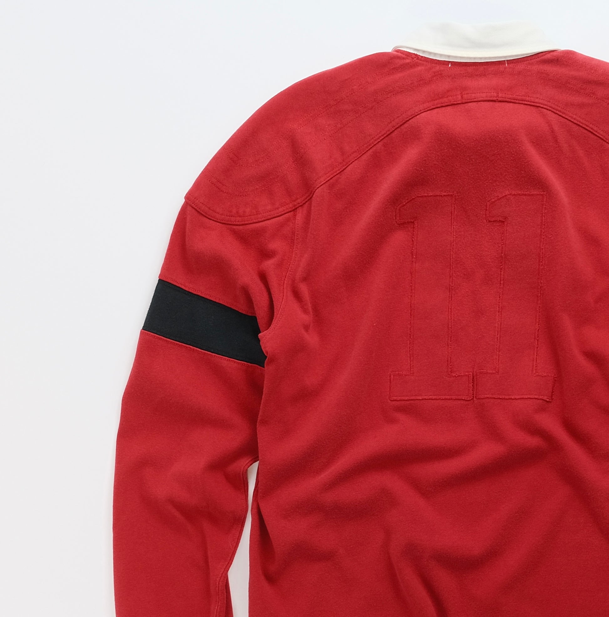 Fai un viaggio nostalgico negli anni '80 con questa autentica polo da rugby Ralph Lauren. Con un corpo rosso e un colletto bianco pulito, riporta in vita il classico fascino sportivo.
