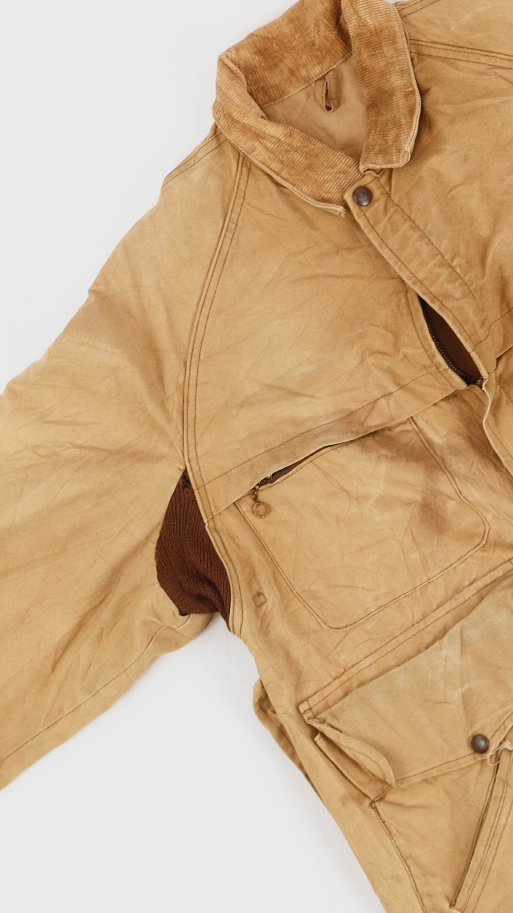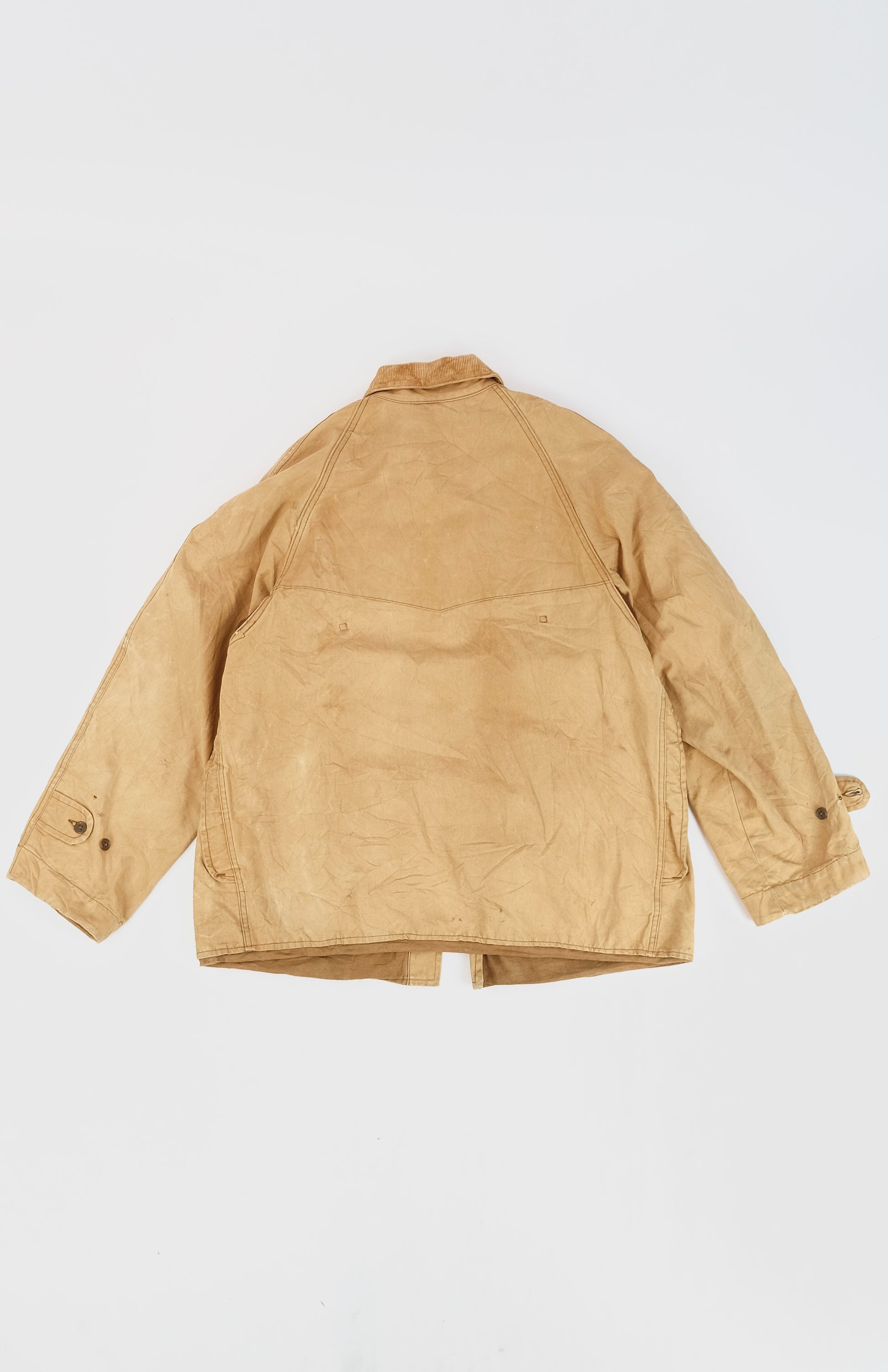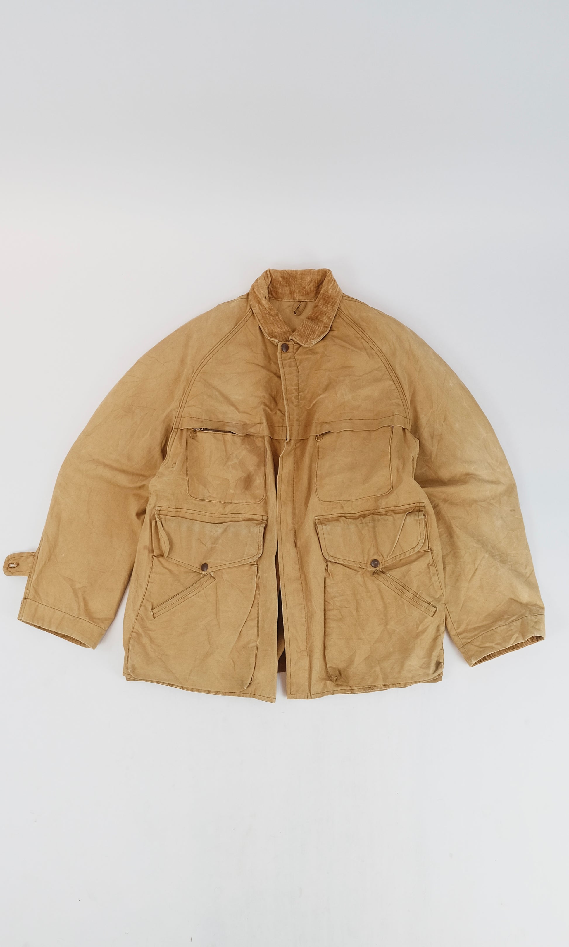 This authentic 1950s hunting jacket, crafted in the USA, features a rich velvet collar and a distinguished patina with subtle fading that speaks to its vintage charm.
