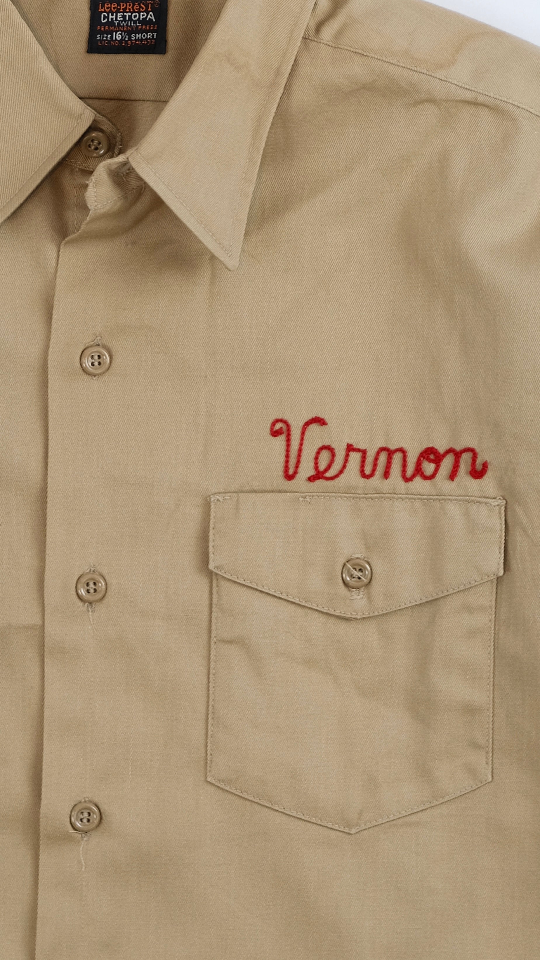 This vintage 50s Lee Prest wool shirt in size M (tagged 16 1/2) features authentic press material with custom chainstitch embroidery on both front and back, Made in USA with Union label still intact.