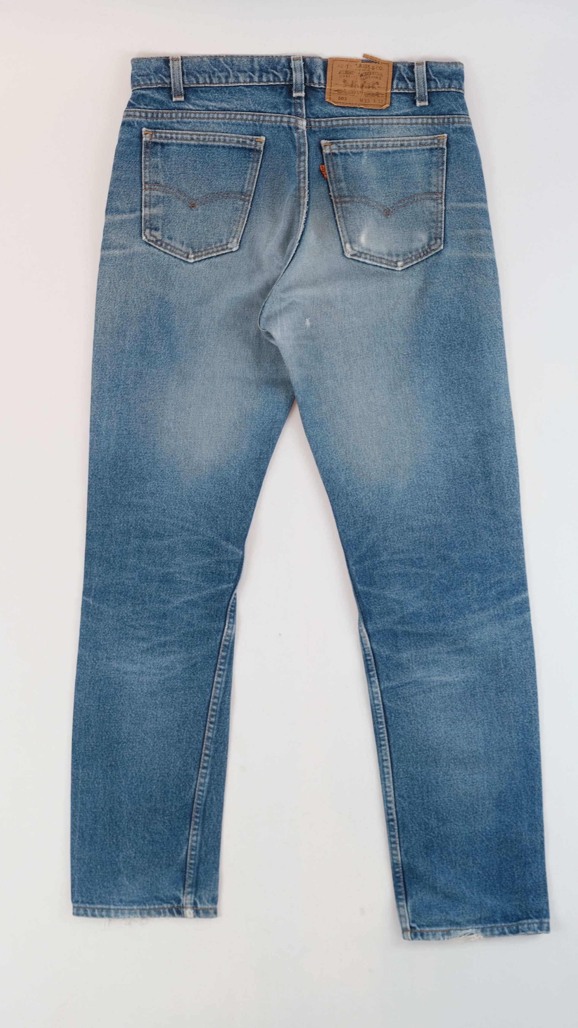These Levi’s 505 jeans from the 1970s come in a blue faded wash with gentle distressing and a W33 size.