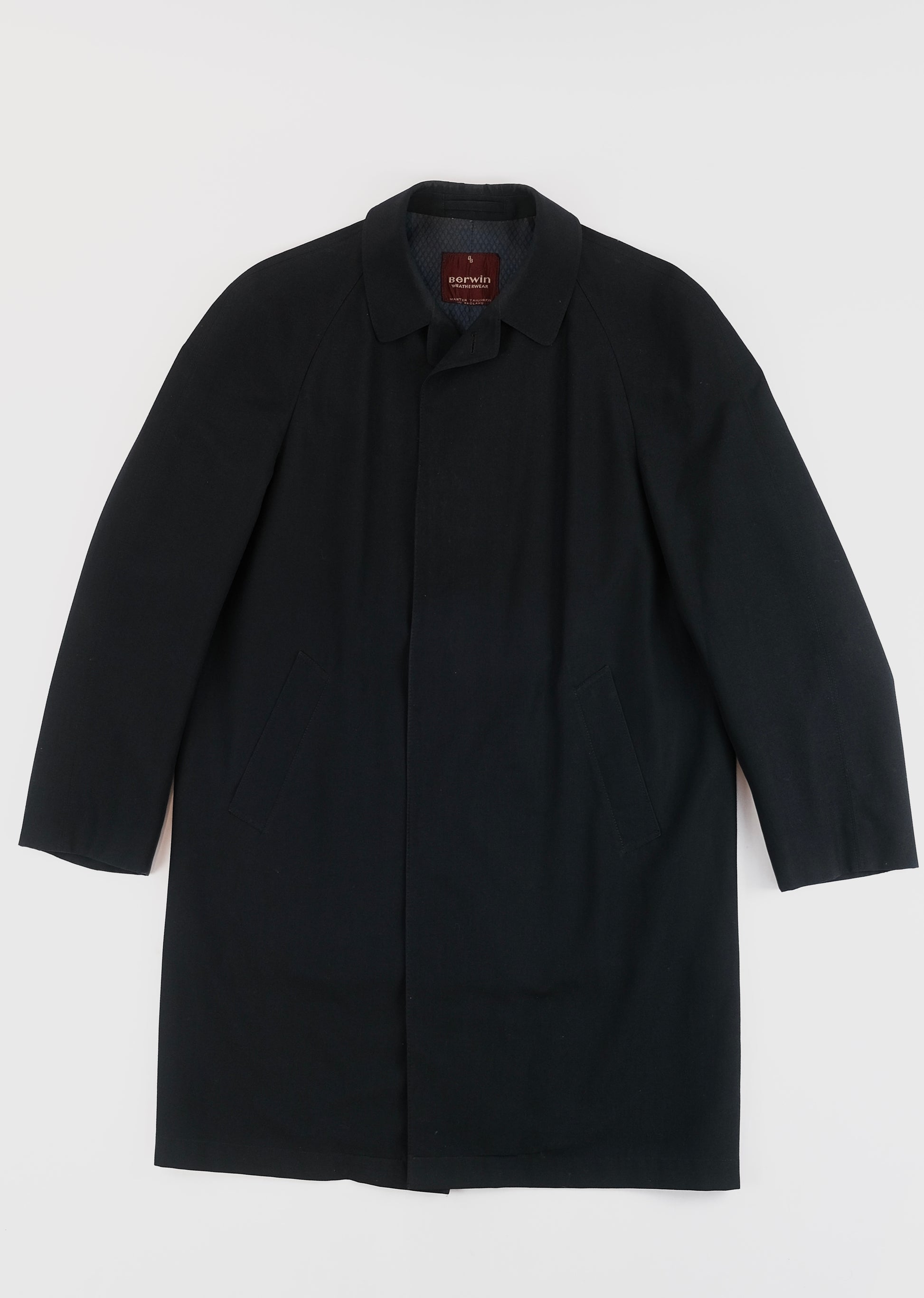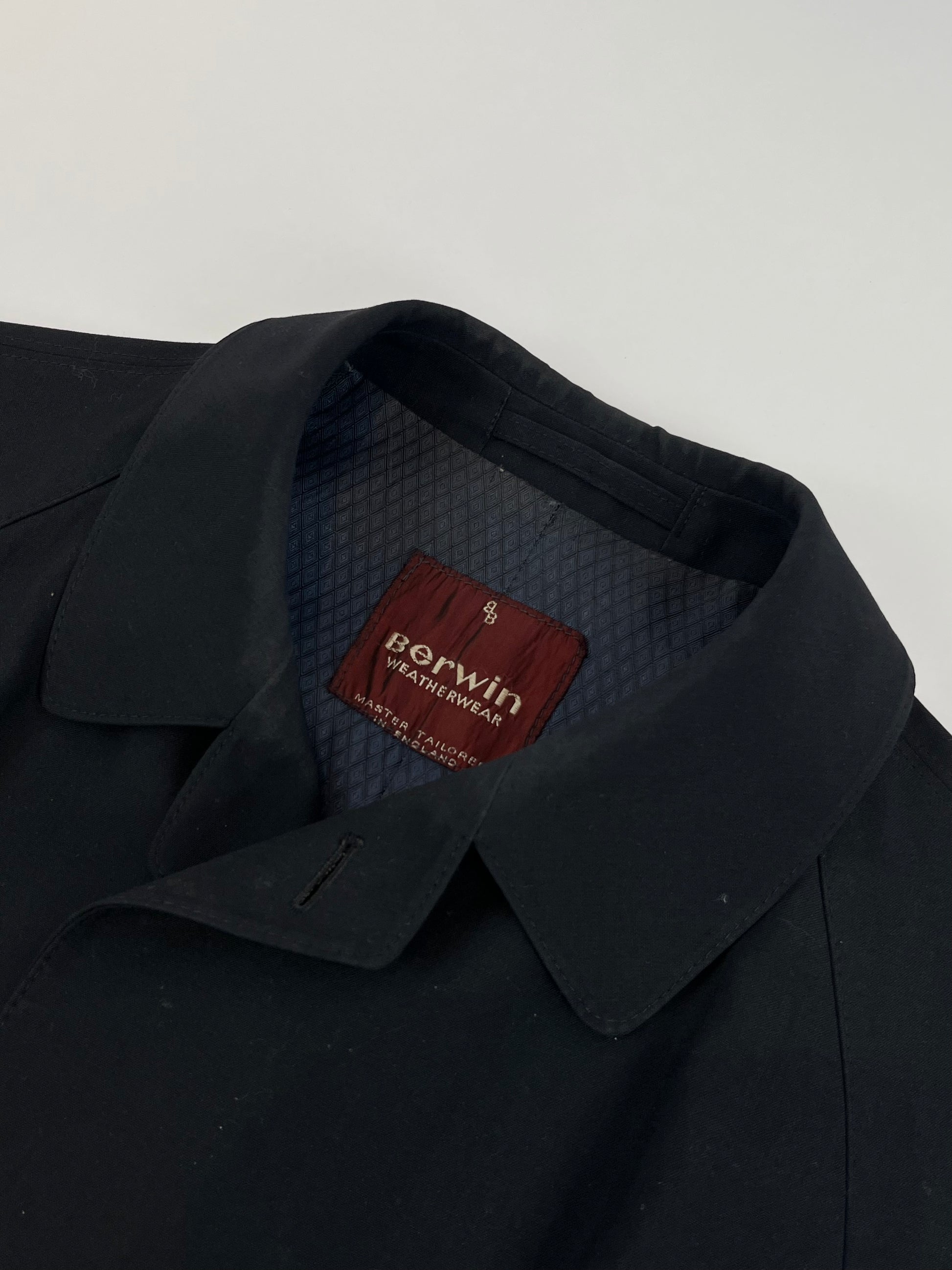 This 80s Berwin trench coat from England offers a timeless look in deep navy blue. Designed to fit approximately a size S, its classic cut ensures a flattering silhouette.
