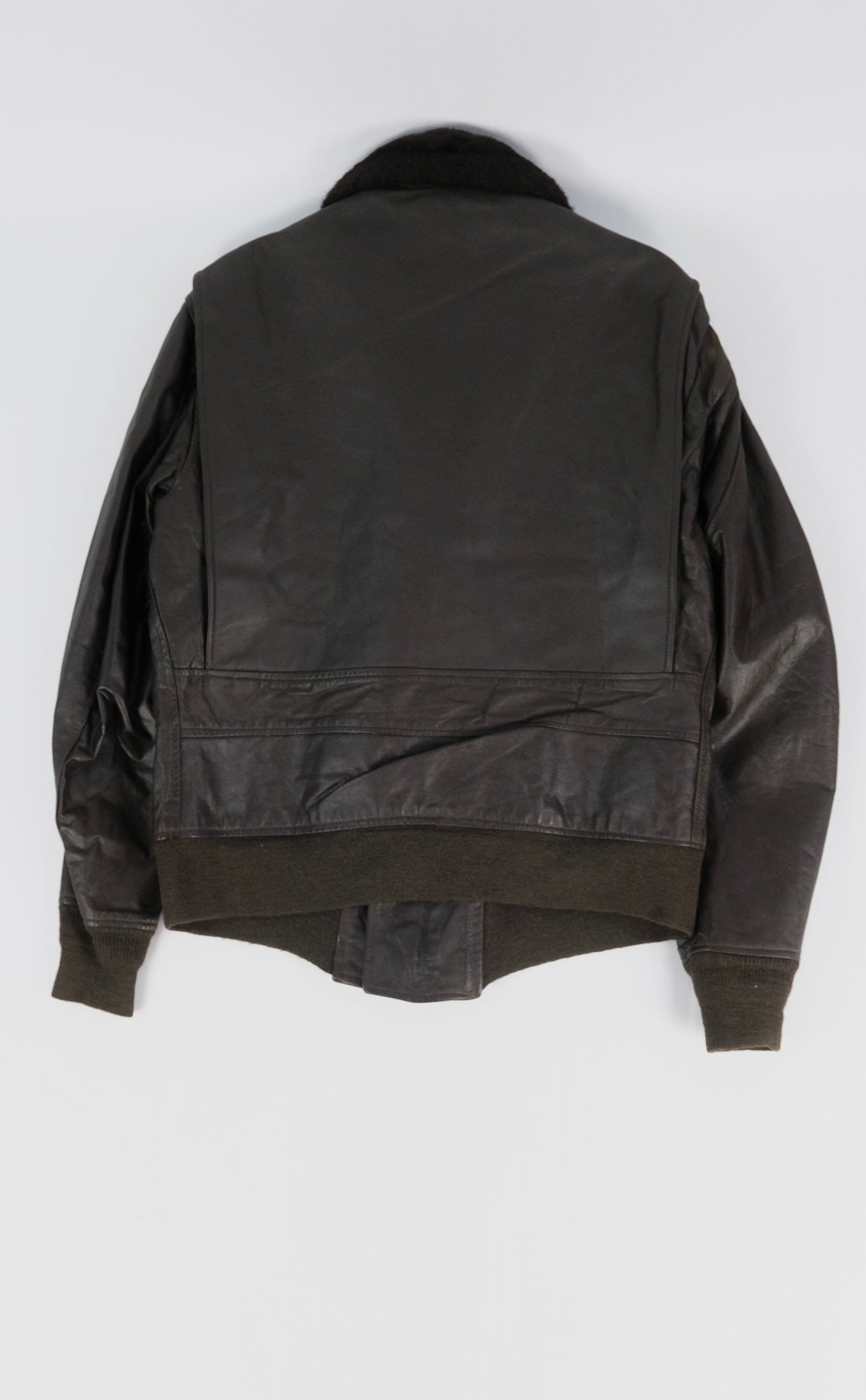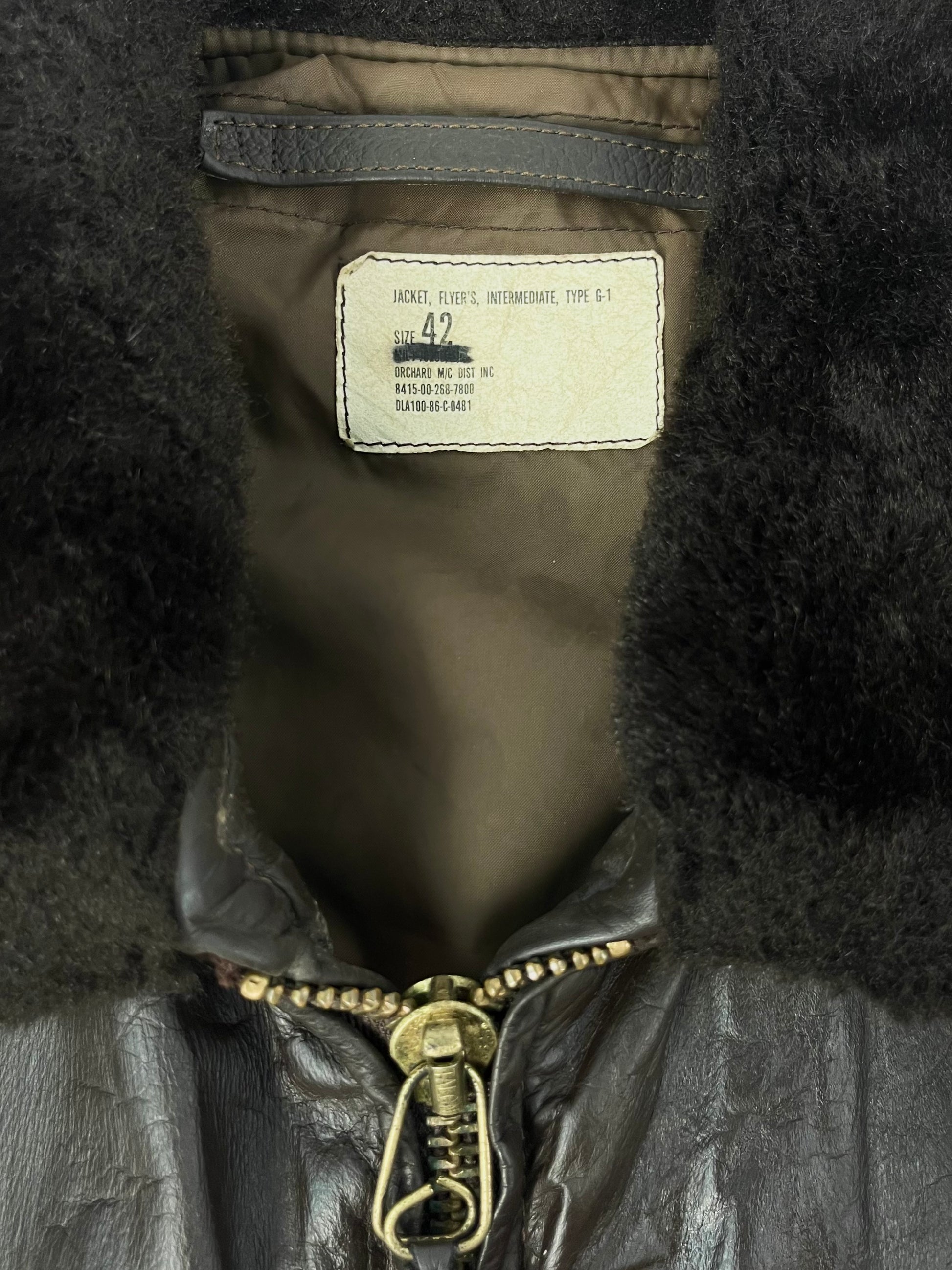 Step into aviation history with this genuine 1980s G-1 USN leather jacket. Manufactured in the USA, this authentic piece features a luxurious fur collar and is tagged size 42, embodying the classic aviator style that never goes out of fashion. Talon zipper.