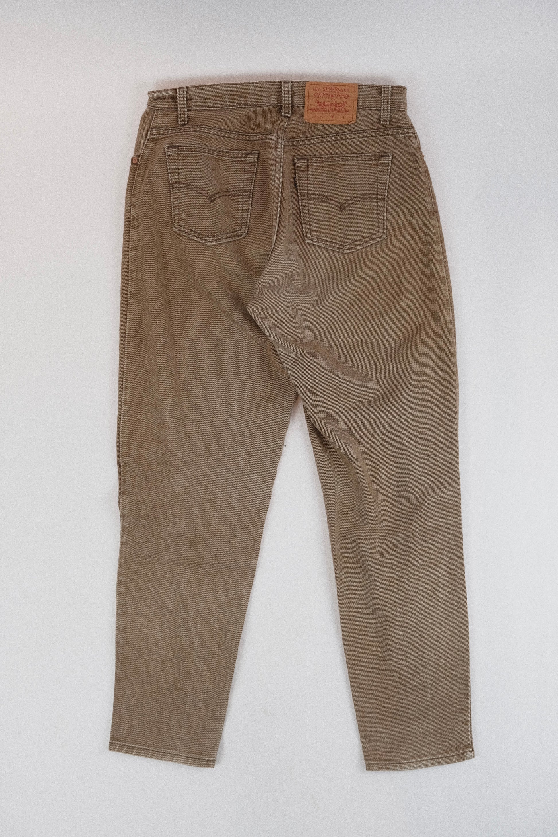Authentic 1980s Levi's denim in rich brown wash, featuring original paper tags and iconic black-and-gold labeling. Crafted in the USA during the brand's golden era, this vintage pair showcases beautiful sun-fading throughout.