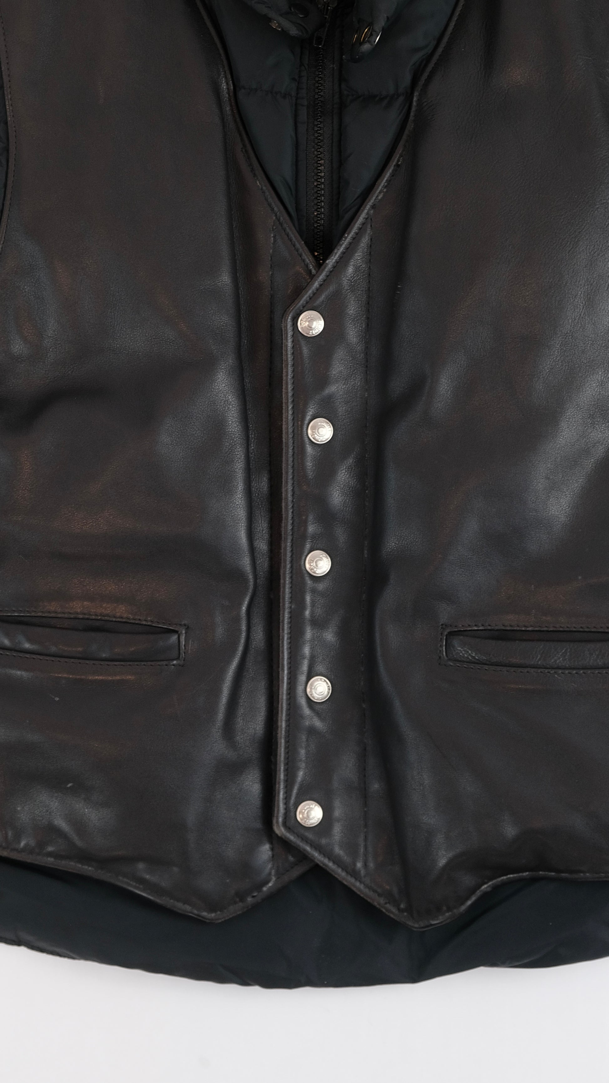 This vintage rare 70s Schott down puffer jacket features a unique leather front vest effect, giving it stylish touch. Made in the 1970s with the original label intact, it’s tagged size 46 but fits comfortably like a modern Large.
