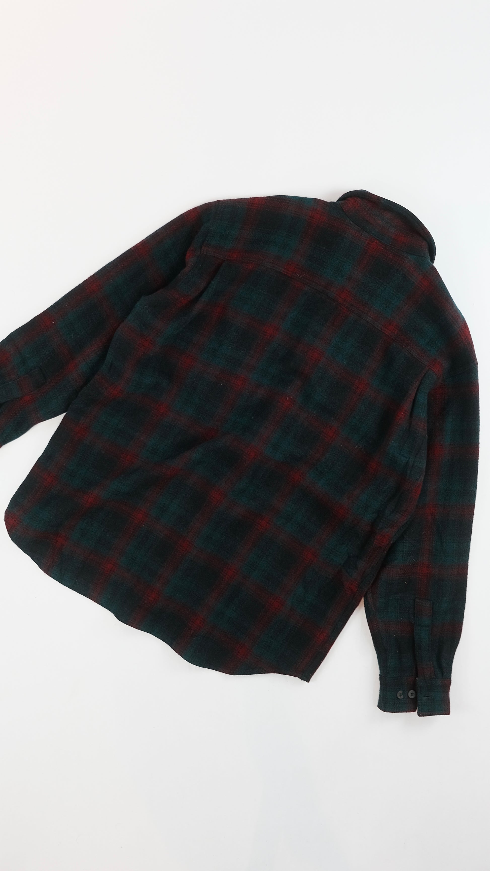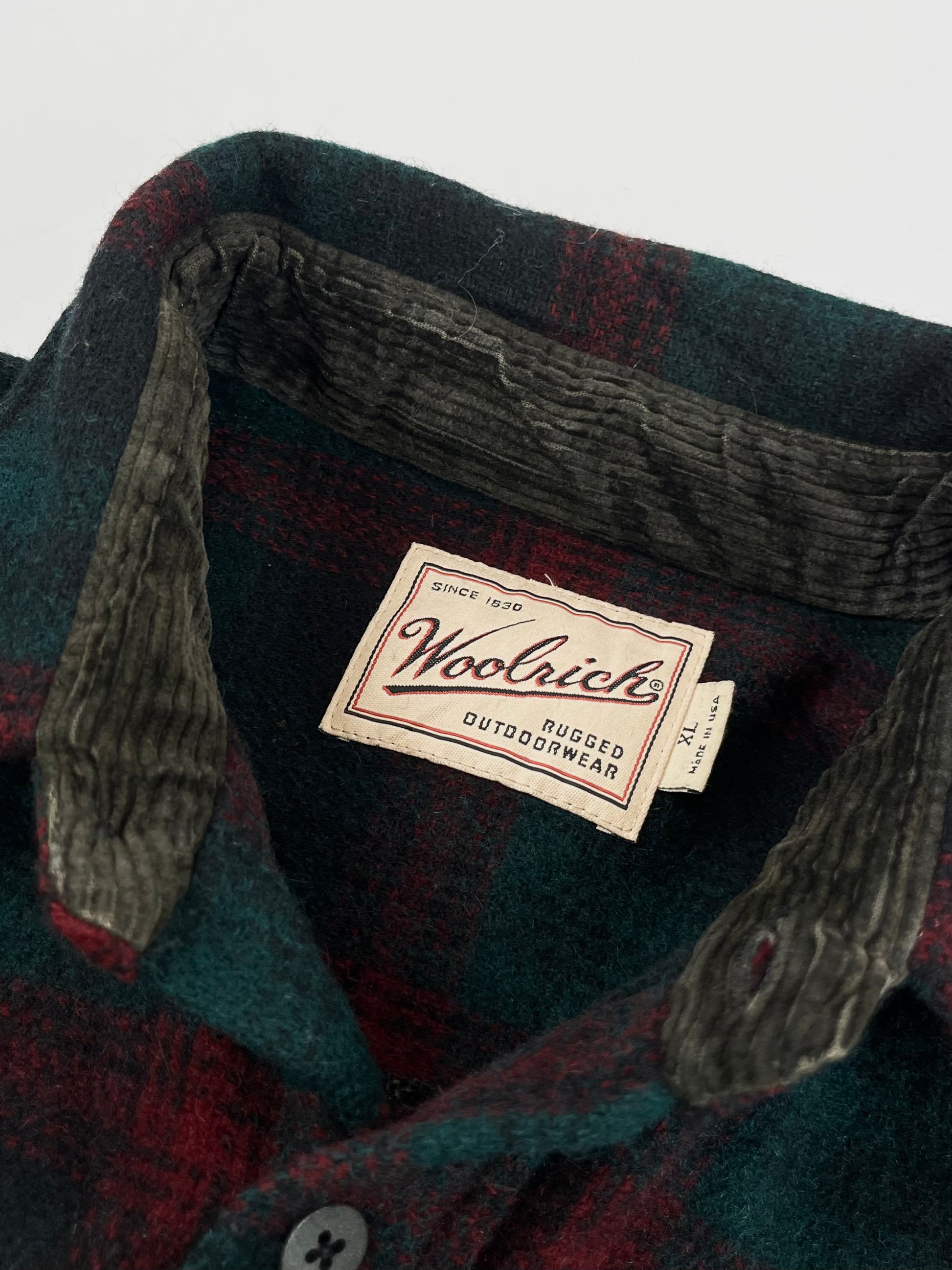 This 1980s Woolrich wool shirt with a checkered fantasy offers a timeless style with a comfortable fit.