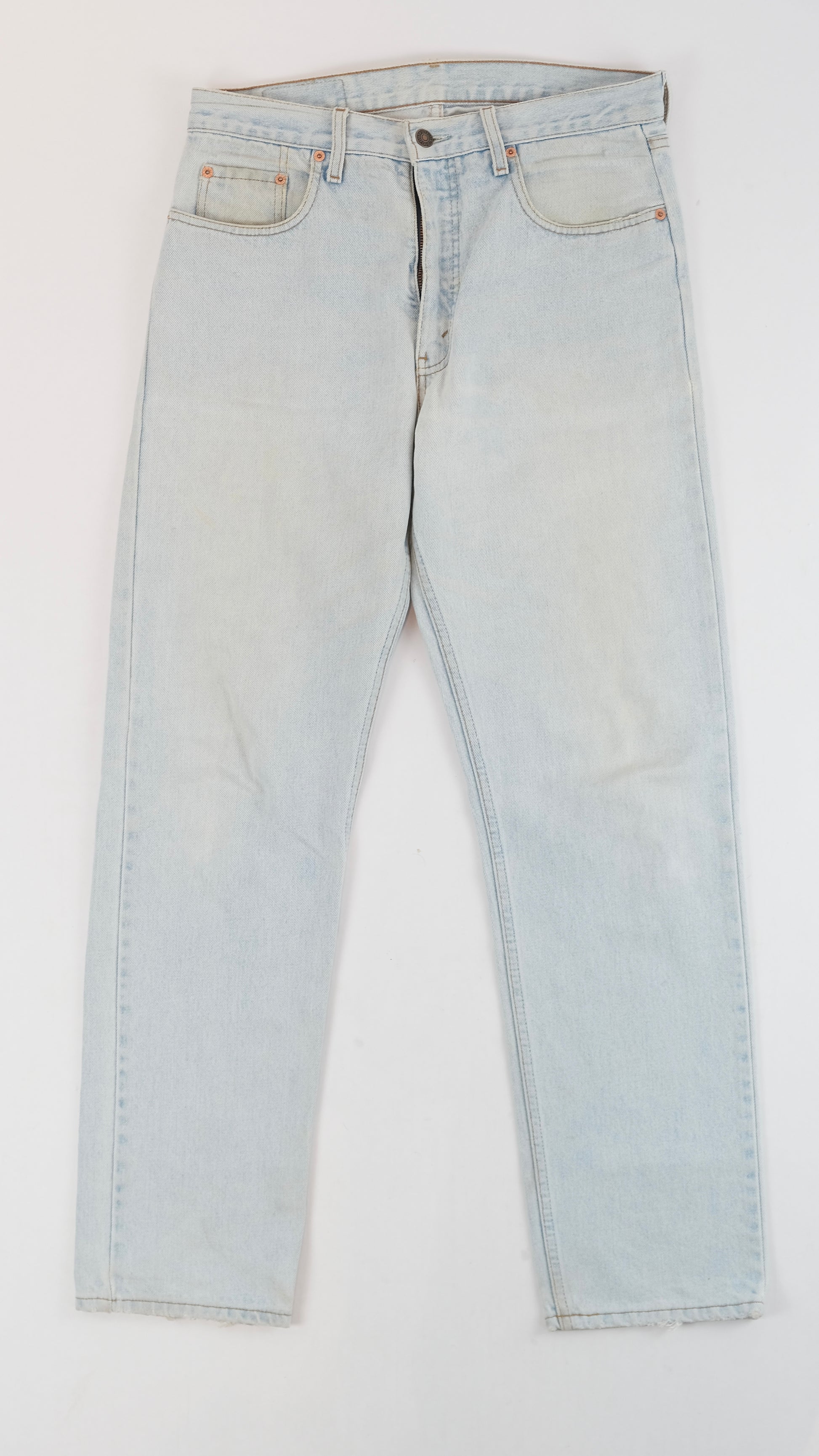 These 90s Levi's jeans feature a light blue, well-faded wash and come in size W32, highlighted by the classic orange tab.