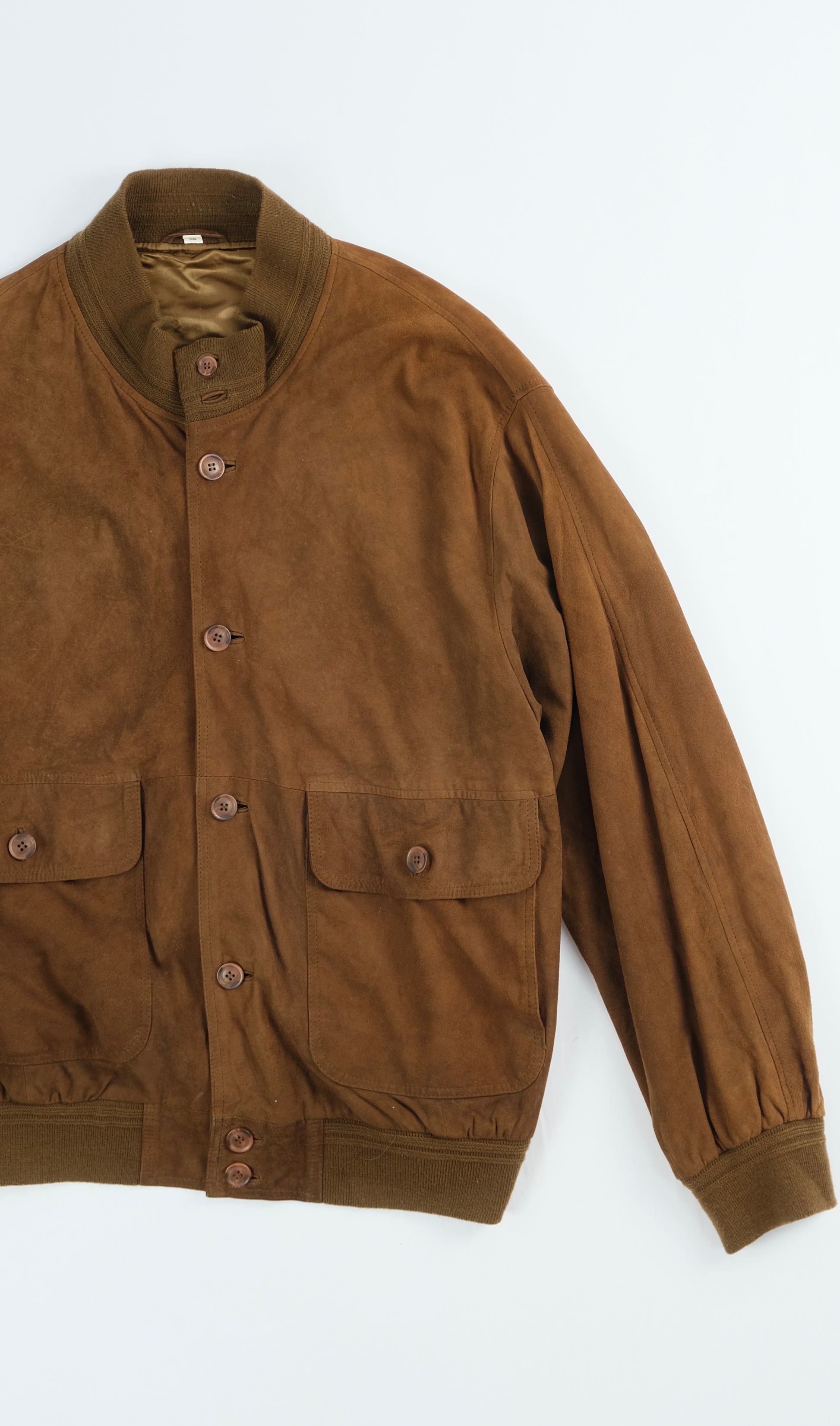 This classic 80s suede bomber jacket in a rich brown hue offers timeless style with a comfortable fit for size L.