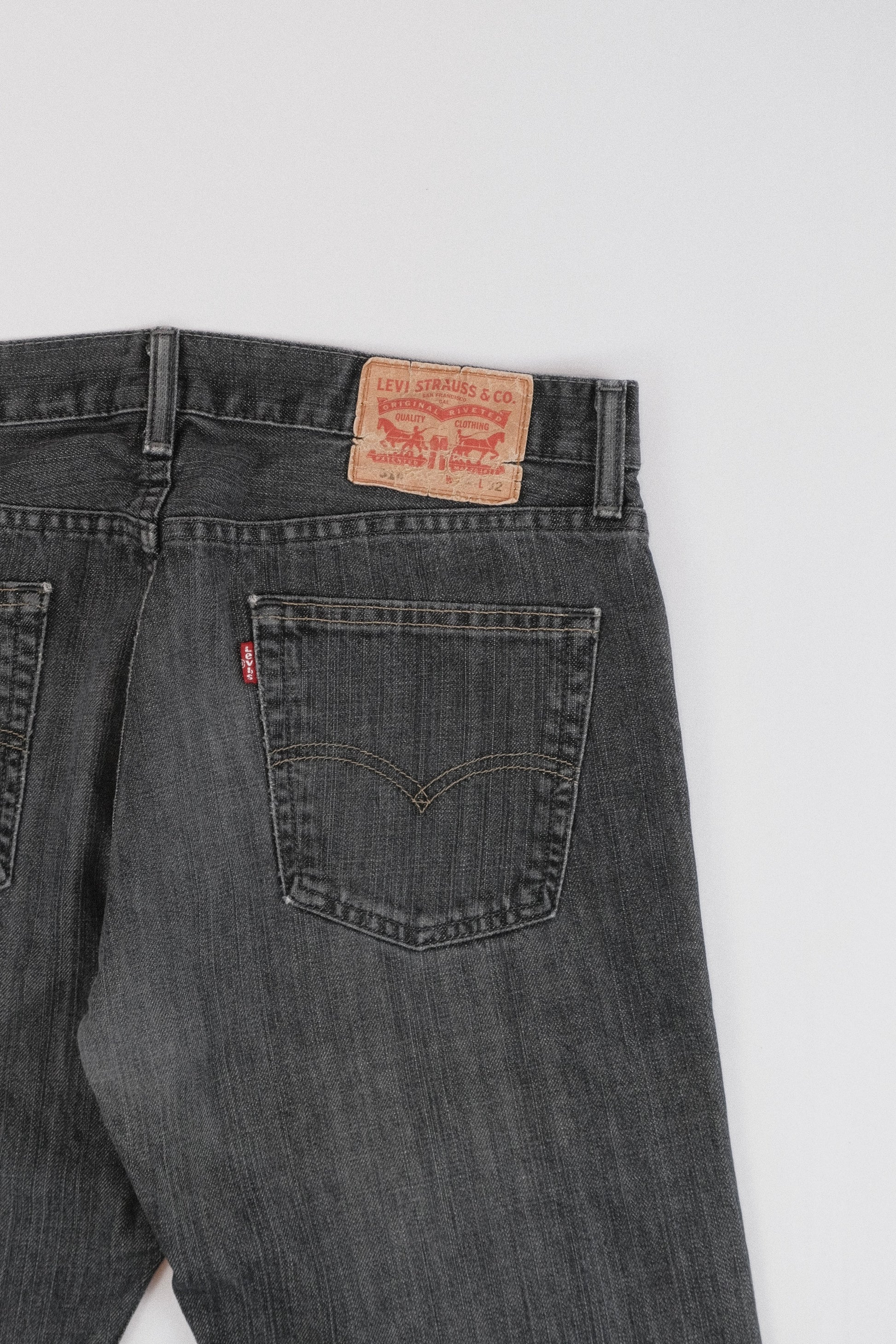 Authentic 90s Levi's jeans featuring distinctive black wash fading and a sophisticated grey tone characteristic of vintage denim from that era.