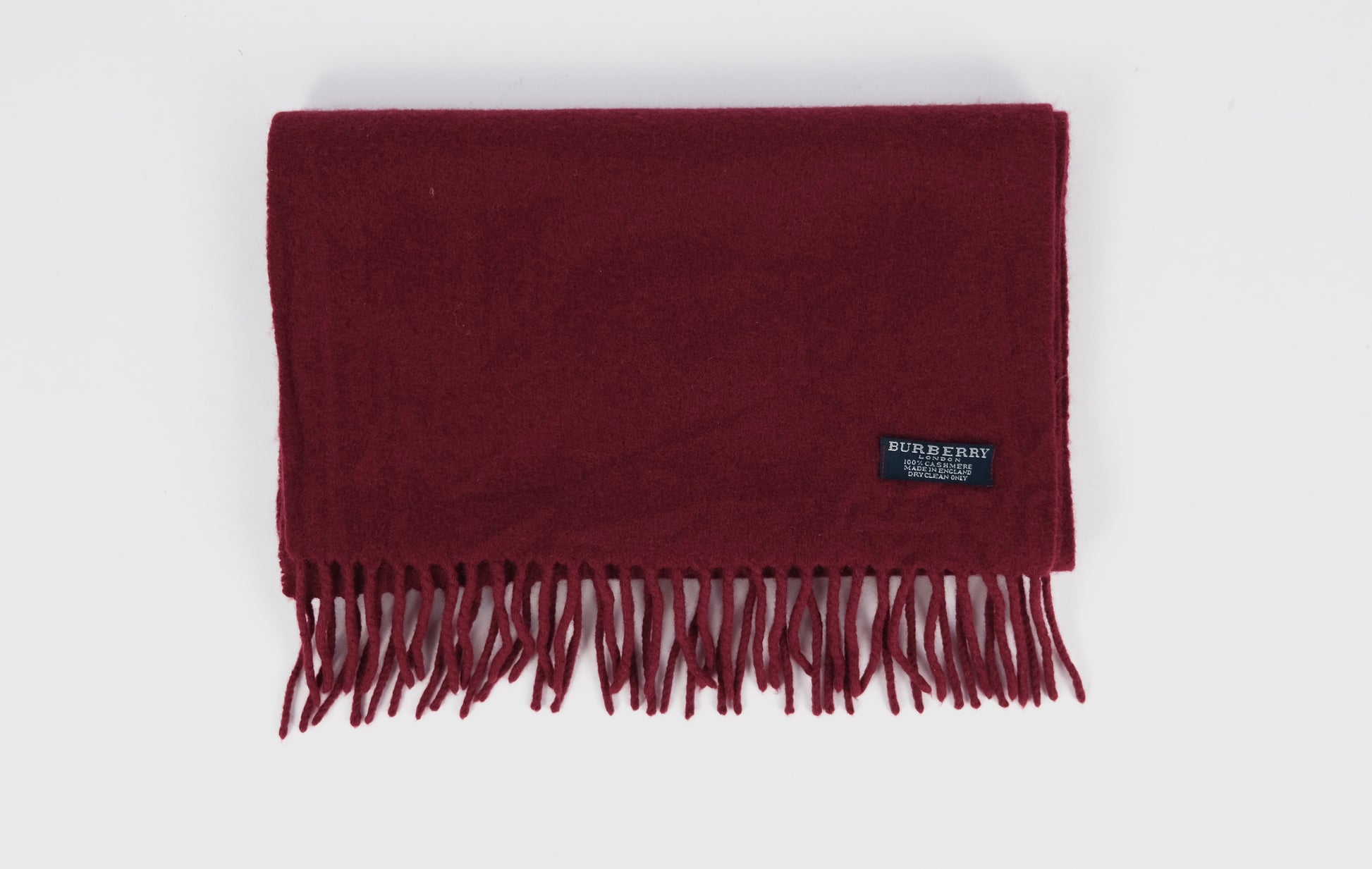 Step into vintage luxury with this authentic 1980s Burberry cashmere scarf, expertly crafted in England. Wrapped in sumptuous burgundy tones, this timeless piece showcases the refined elegance Burberry is renowned for.
