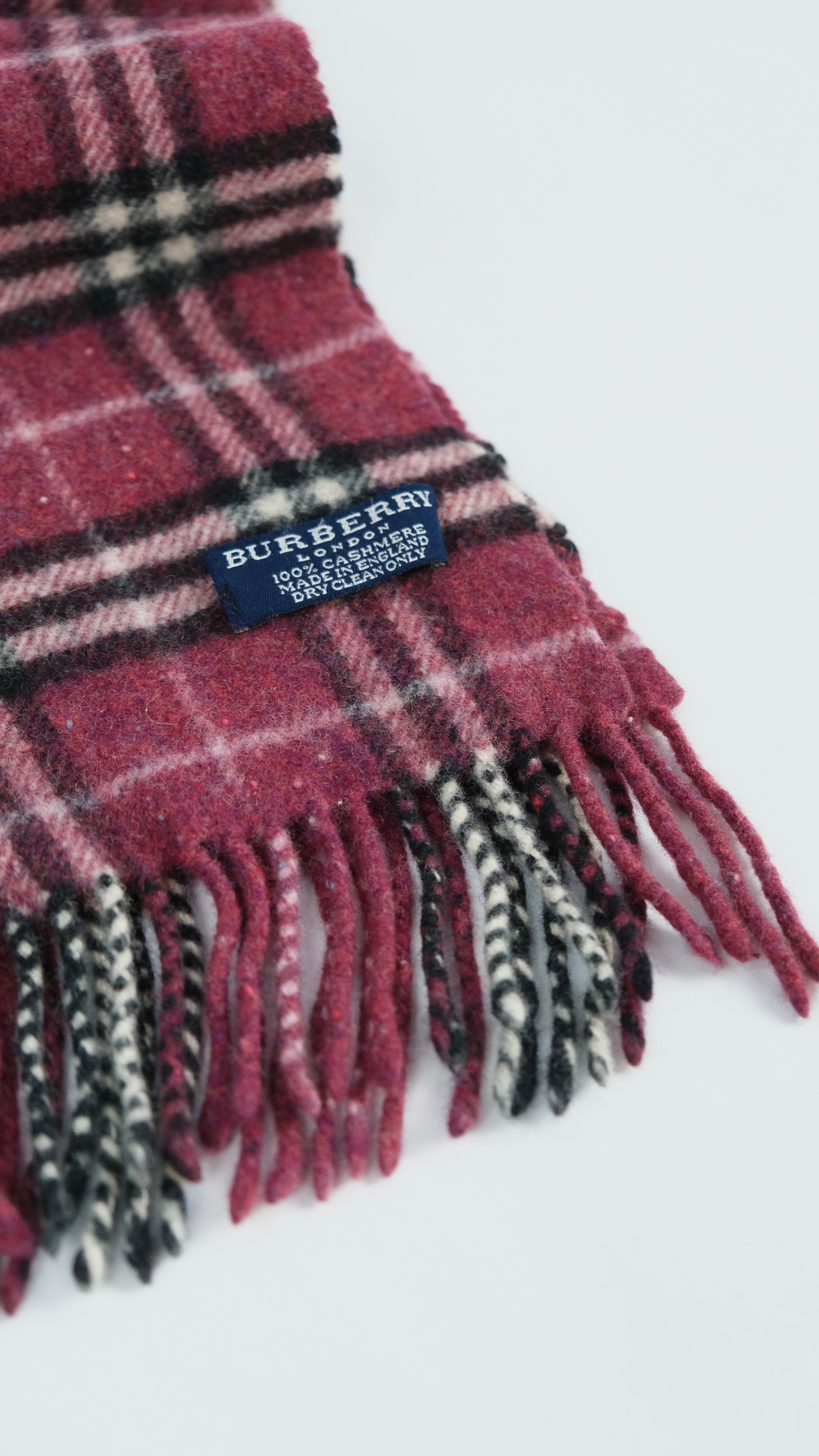 Discover timeless elegance with this authentic vintage Burberry scarf, featuring the iconic tartan check pattern in rich red burgundy tones. Crafted from luxurious 100% cashmere, this piece offers unparalleled softness and warmth.