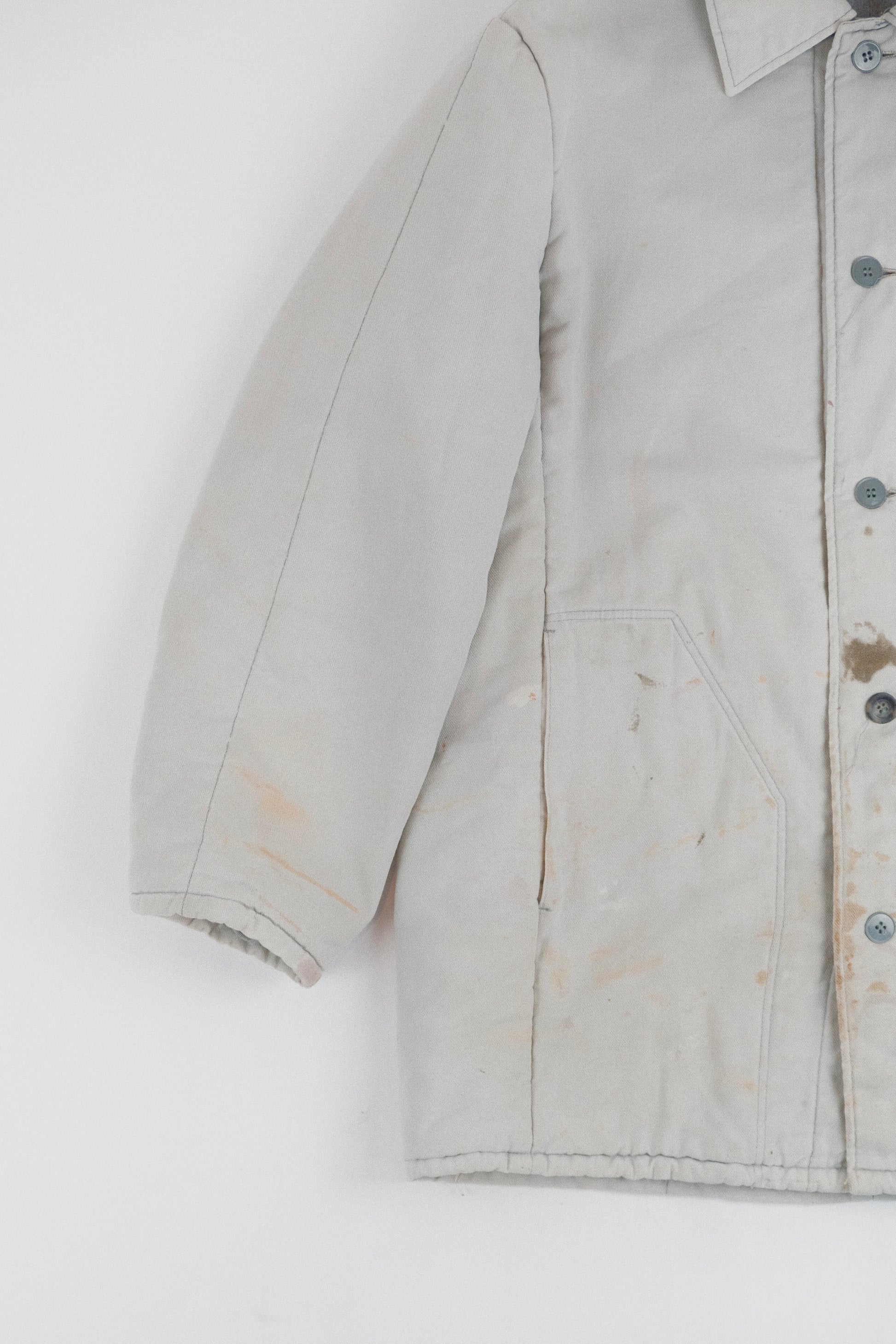 This vintage heavy work jacket is a true statement piece with authentic character. Crafted from durable material with a quilted interior for exceptional warmth, it features a beautifully sun-faded finish and distressed detailing that tells the story of decades past.