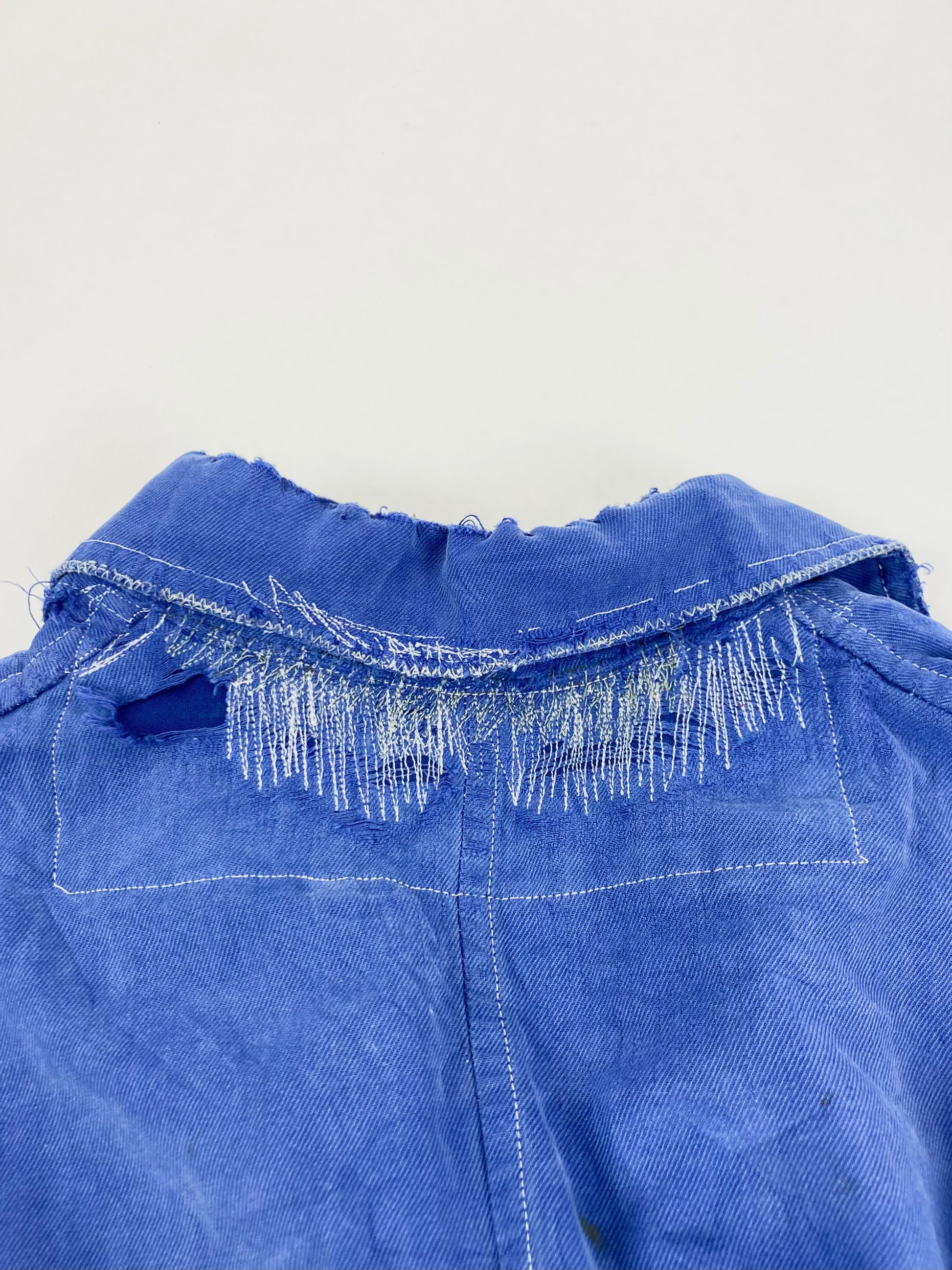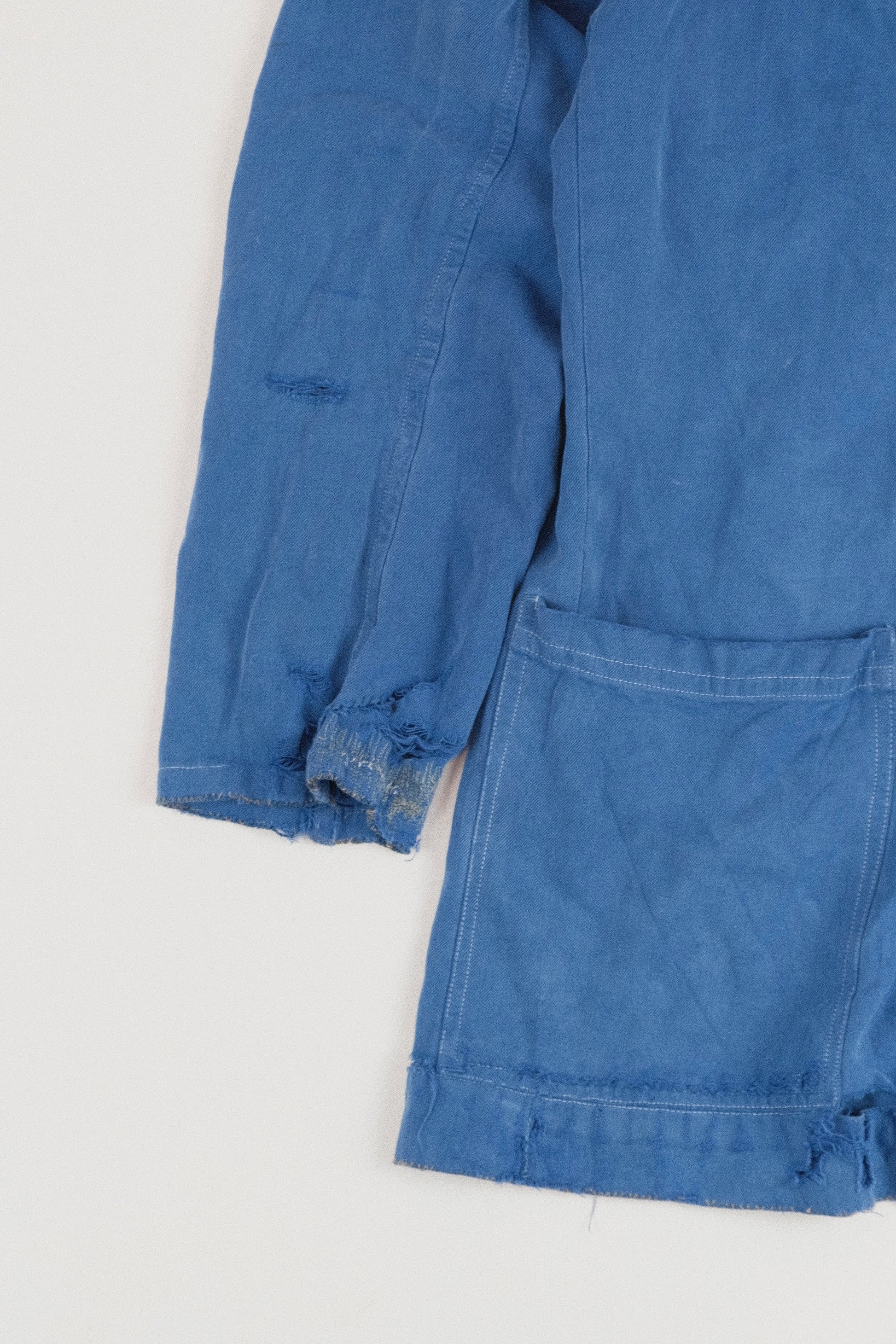 This authentic vintage work jacket captures decades of honest wear and character. Cut in a classic blue de travail, the fabric shows beautiful sun-fading and distressing that tells a story of real use. What makes this piece special are the contrast-colored stitching repairs—visible mends that add charm and authenticity rather than detract from it.
