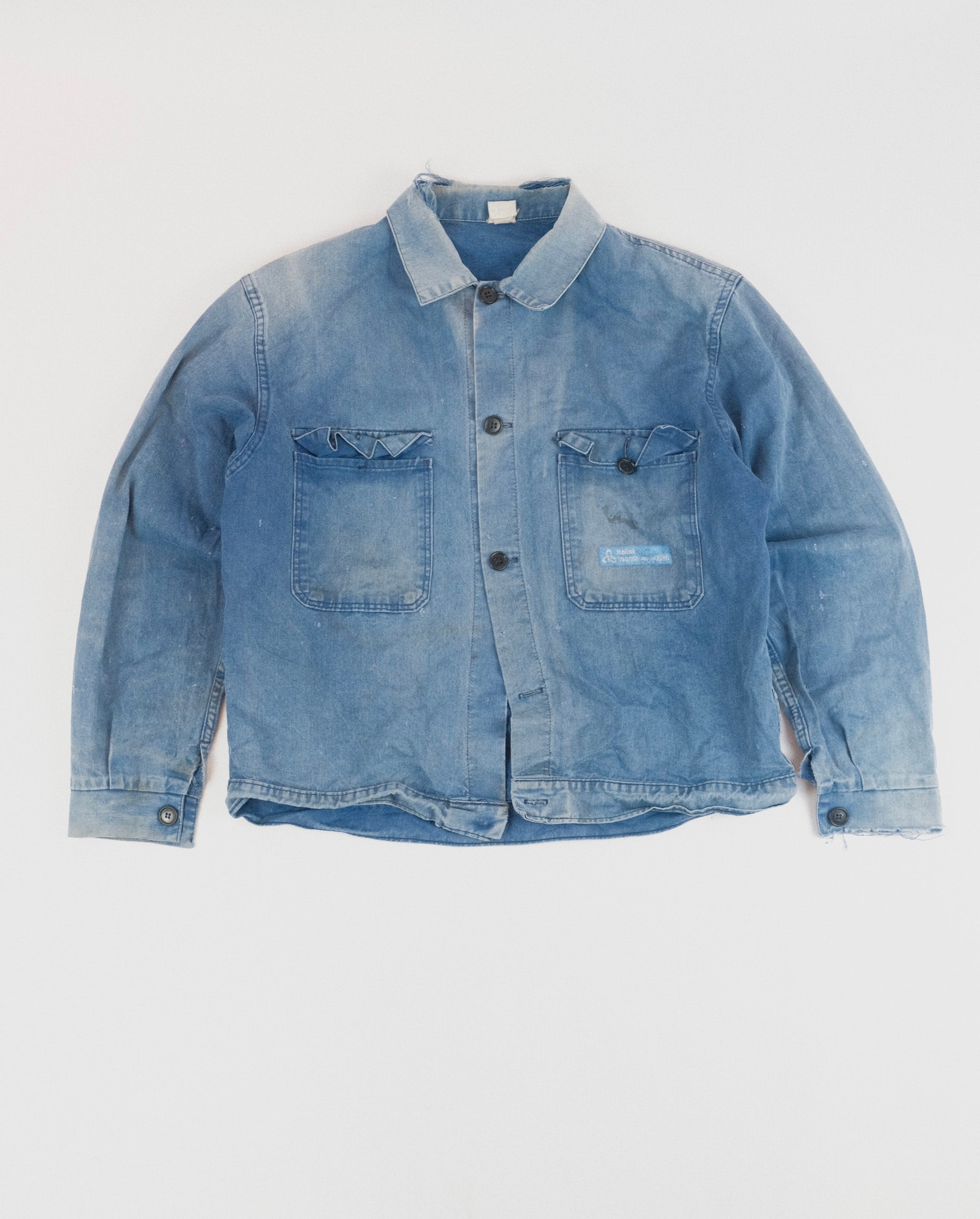 Step into authentic workwear history with this charming vintage jacket. The classic French blue fabric bears the natural patina of genuine wear—sun-bleached tones and subtle distressing that only time can create. Practical details include two front pockets and a distinctive printed patch, while the cropped silhouette offers a modern edge to traditional workwear styling.